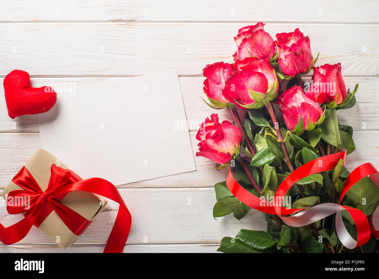 Valentane S Day Background Red Rose Flower Bouquet And Present Box On White Wooden Table Top View With Copy Space Stock Photo Alamy