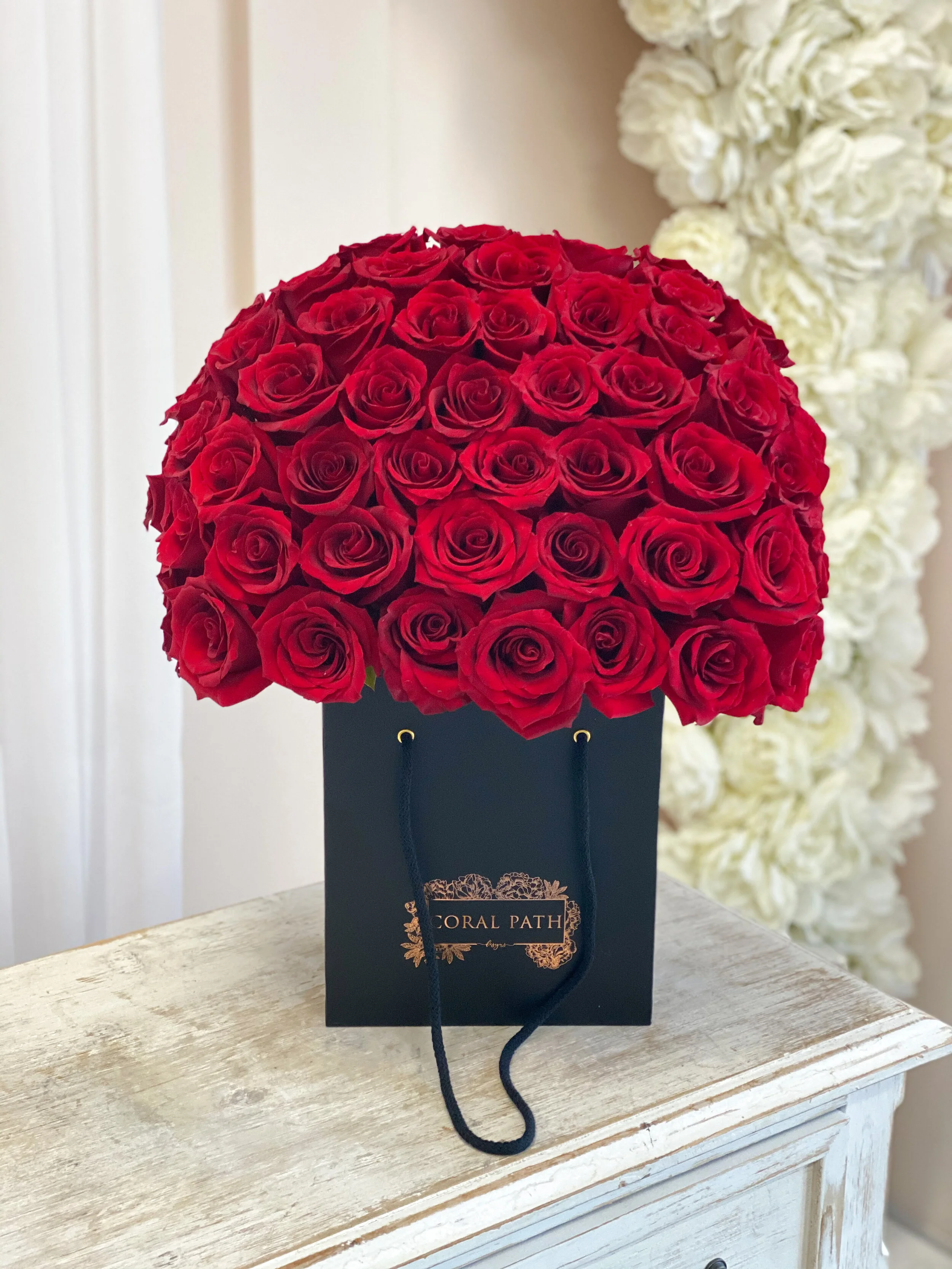 Red Roses In A Bag Box Coral Path Designs Flower Arrangements Flower Delivery Flower Bouquets